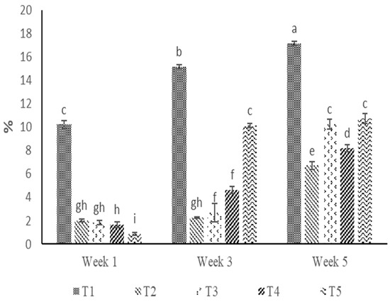 Sadeyen et al. [31] highlighted that Salmonella is a common bacterium that is found in table eggs. Such pathogens inhabit the intestines of most avian species and are transmitted vertically in their offspring. The authors further highlighted that the risk of Salmonella infection increases with the time of storage. Table 5 shows the effects of five treatments on bacterial counts of Salmonella enterica (ATCC 53648) on the surface of eggs during storage at 25 °C.