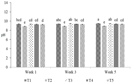 Figure 2 represents the changes in the pH of the albumen of coated and uncoated eggs that were stored at 25 °C for five weeks. Egg freshness and quality can be estimated from the albumen pH. The albumen pH of freshly laid eggs ranges between 7.6 and 8.5 [27]. In the present study, the pH value for uncoated eggs significantly (p < 0.05) increased after five weeks of storage. After the egg is laid, CO2 loss through eggshell pores occurs. This leads to changes in the bicarbonate buffer system. As a result, the albumen pH increases during storage [28]. The lowest pH values were recorded for the eggs coated with only SPS-based coating. On the other hand, the continuing breakdown of the constituents in egg white and/or a change in the bicarbonate buffer system may lead to the decrease in albumen pH during storage [29]. However, before and after storage, differences in egg size, initial egg quality, and storage conditions (temperature, humidity, and period) may affect the albumen pH [9].