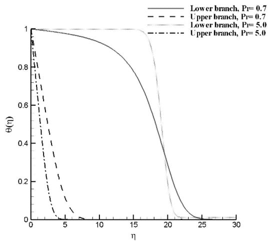 - Heat flux at the surface reduces with the increase of and in the upper solution branch. The reduced Sherwood number is enhanced when is increased, whereas it reduces with increasing .