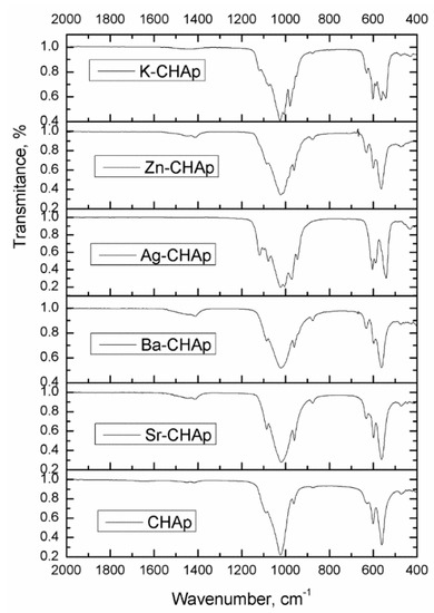 FTIR spectra for CHAp and Me-CHAp (Me = Sr, Ag, Ba, Zn, K).