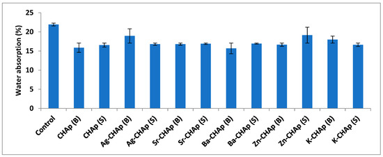 Water absorption for control, CHAp and Me-CHAp (Me = Sr, Ag, Ba, Zn, K).