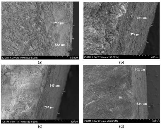 The layer varies between 30–90 μm, which is in good agreement with other literature report [39]. By brushing, the layer is thickened, as SEM images shown (Figure 10a–d).