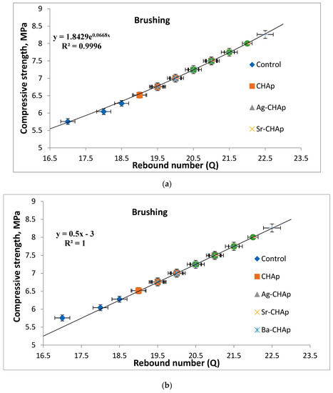 The compressive strength vs. rebound index relationship for model stones coated with carbonated hydroxyapatite derivatives. (a) samples treated by brushing, exponential graphical representation; (b) samples treated by brushing, linear graphical representation; (c) samples treated by spraying, exponential graphical representation; (d) samples treated by spraying, linear graphical representation.