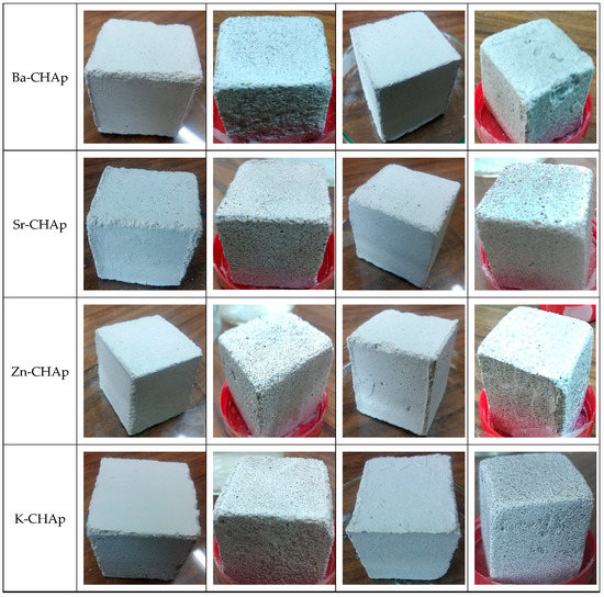 After analyzing these results, it could be concluded that the brushing procedure could offer a more efficient coating of the model stone specimens, while the spraying procedure, evenly induces good compressive strength, produces mechanical ruptures along the edges (Zn-CHAp, Ba-CHAp, Ag-CHAp), fractures (Zn-CHAp, Ba-CHAp, Ag-CHAp), grooves in depth (Zn-CHAp, K-CHAp, Ba-CHAp, Sr-CHAp), shrinkage cracks (CHAp), brown patina (Zn-CHAp).
