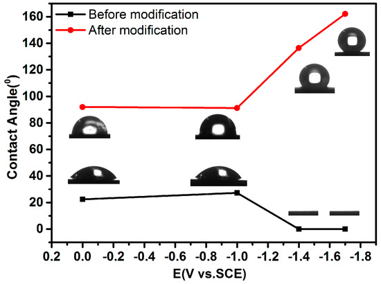 The water contact angles of the samples deposited at different potentials before and after modification by PFTEOS.