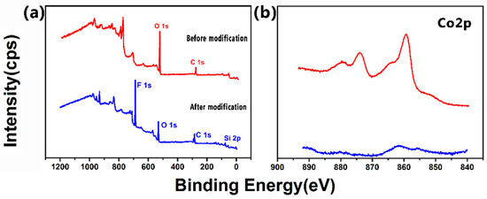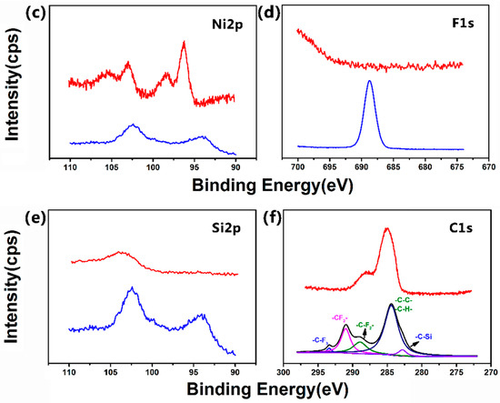 XPS spectra before and after modification of the Co–Ni coating deposited under the applied potential at −1.7 V in the mixed solution: (a) XPS survey spectra; (b) Co 2p spectra; (c) Ni 2p spectra; (d) F 1s spectra; (e) Si 2p spectra; and (f) high resolution C 1s spectra.