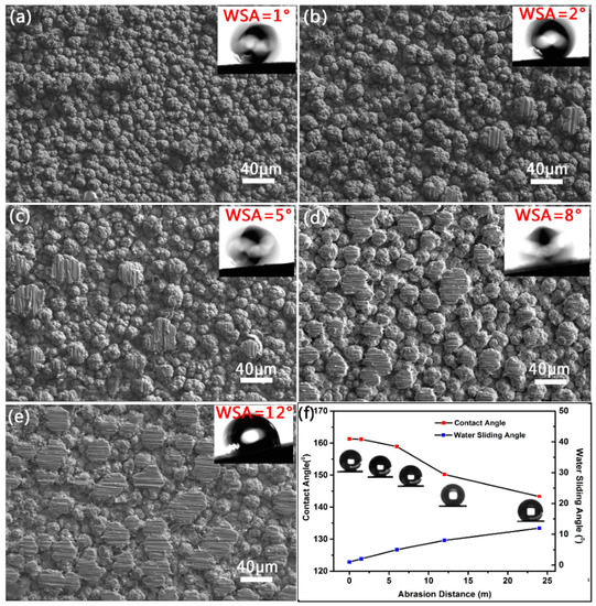 SEM images for (a) super-hydrophobic Co–Ni coating before abrasion and after abrasion under the applied pressure of 5 kPa for (b) 1.5 m, (c) 6 m, (d) 12 m, and (e) 24 m; (f) The water contact angle and water sliding angle variations on these surface with the abrasion distance. The insert images in (a) to (e) are the profiles of a water droplet sliding on the Co–Ni coating with different water sliding angles.