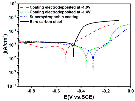 Potentiodynamic polarization curves of the bare carbon steel, Co–Ni coating deposited at −1.0 and −1.4 V, and super-hydrophobic Co–Ni coating deposited at −1.7 V after immersion in 3.5 wt.% NaCl aqueous solution for 1h with a scan rate of 0.5 mV/s.