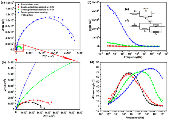 EIS results of the bare carbon steel, Co–Ni coating deposited at −1.0 and −1.4 V, and super-hydrophobic Co–Ni coating deposited at −1.7 V in 3.5 wt.% NaCl solution after immersion for 1 h: (a) Nyquist plots; (b) high-resolution Nyquist plot in (a) marked with red box; (c) bode −|Z| versus frequency plots; and (d) bode-phase angle versus frequency plots. (e) Equivalent circuits for simulating EIS results of bare carbon steel. (f) Equivalent circuits for simulating EIS results of the Co–Ni coating deposited at −1.0 and −1.4 V, and the super-hydrophobic Co–Ni coating deposited at −1.7 V.