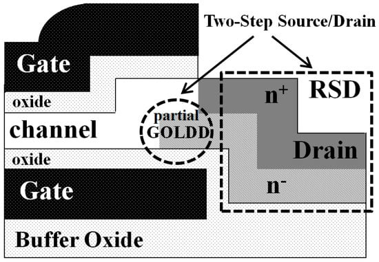 Many structures have been reported to be able to reduce the high DEF and thus to improve the device characteristics [3,6,7,8,9,10]. The offset-gate device was shown to lower the DEF effectively, but its On-current was also significantly decreased because of an additional series resistance [6]. Lightly doped drain (LDD) [7], RSD [8,9], and GOLDD [10] were proposed to reduce the series resistance problem. Even though the above mentioned structures could effectively lower the high DEF, the ON-current of those structures still need to be improved when considering the current driving capability and high-resolution display applications. In addition, most RSD structures need to adopt chemical mechanical polishing (CMP) processes [9]. Therefore, to implement a low DEF device with a reduced leakage current and an improved operation current structure at the same time is a very important issue for designing a high performance poly-Si TFT.