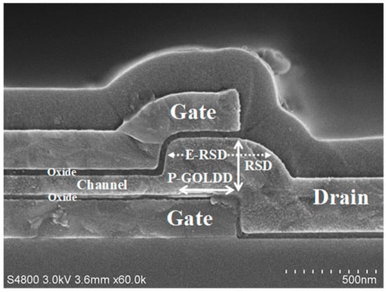 To fabricate the device, an n+ poly-Si layer (200 nm) was first formed on oxidized silicon wafers, and this layer was then patterned to be the bottom gate. After that, an oxide (50 nm) and an undoped α-Si (200 nm) were deposited. A phosphorous ion implantation (dose = 1 × 1013 cm−2 at 40 keV) was used, and a GOLDD area was defined. Figure 2 illustrates the main process steps of a DGTSD-TFT. An undoped α-Si with 100 nm thickness was formed, after which the active area was patterned. Thereafter, this α-Si channel layer was recrystallized in a furnace for 24 h at 600 °C to become the poly-Si film. Then, a top gate oxide (50 nm) and an n+ poly-Si top gate (200 nm) were in turn deposited. After patterning the top gate region, a phosphorous implantation was performed to make the drain and source regions. Subsequently, a 0.2 μm oxide was formed to serve as the passivation layer. Finally, contact areas were opened and an Al-Si-Cu metal layer was accomplished and defined to be the metal pads afterward. Further improved device characteristics can be achieved by applying an H2 or NH3 treatment. The scanning electron microscopy (SEM) photography for our DGTSD-TFT with a 0.5-μm P-GOLDD region and a 300 nm RSD structure is shown in Figure 3.