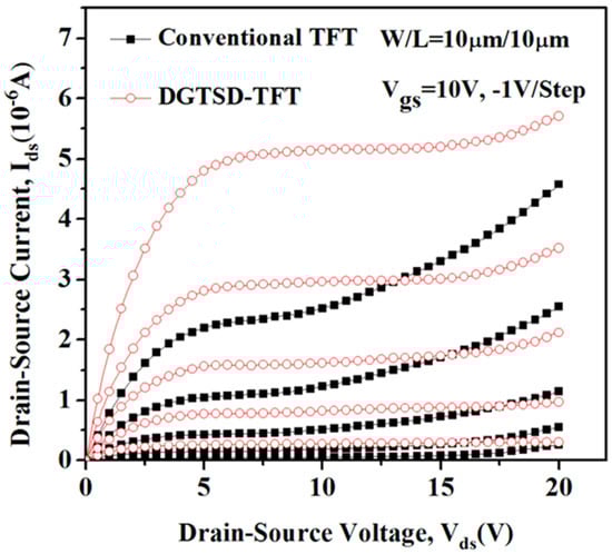 In order to investigate the reduction of the DEF and impact ionization rate (IPR) in DGTSD-TFT compared to a single top gate traditional device, two dimensional device numerical simulations were adopted by using the ISE-TCAD simulator [3,18]. Analyzing the location and magnitude of high DEF, which can be simulated using the simulation methodology in our previous work [16], can validate the improvement of DEF with the proposed structure. Since the kink effect is caused by a great deal of impact ionization, we can also achieve a suppressed kink effect device by designing a low IPR structure [3]. Furthermore, the device leakage current can be predicted by simulating the device DEF with a negative gate bias [9]. From the simulation results (simulated at Vds = 10 V and Vgs = 5 V), the maximum DEF and IPR are 2.51 × 105 V/cm and 3.72 × 1027 cm−3/s for our DGTSD structure, respectively, and those numbers are 3.59 × 105 V/cm and 2.73 × 1028 cm−3/s for an STG traditional device. If a traditional DG TFT is modeled, these values are much higher than those in an STG device because of the DG superposition effect [16]. The detailed simulation comparisons for convention STG and DG devices can be found in our previous publication [16]. A negative gate bias was simulated to predict the devices’ leakage characteristics. The simulated maximum DEF (Vgs = −5 V and Vds = 5 V) is 4.48 × 105 V/cm for our DGTSD design and 7.07 × 105 V/cm for a conventional structure. The reduced DEF and IPR in DGTSD-TFT will be beneficial for lowering the device leakage current and mitigating the kink phenomenon even when a DG structure is used. Moreover, the operation current of our proposed device is increased. Figure 4 depicts the measured output Vds-Ids curves for a DGTSD-TFT and for an STG traditional device. The On-state current of DGTSD-TFT is about twice as large as that of the STG traditional structure. It is obvious that the kink effect of our DGTSD-TFT can be overcome and repressed effectively by virtue of the design of the P-GOLDD and E-RSD structure (two-step source/drain design). These designed structures are very helpful in decreasing the TFT high DEF problem and in improving the device performance.