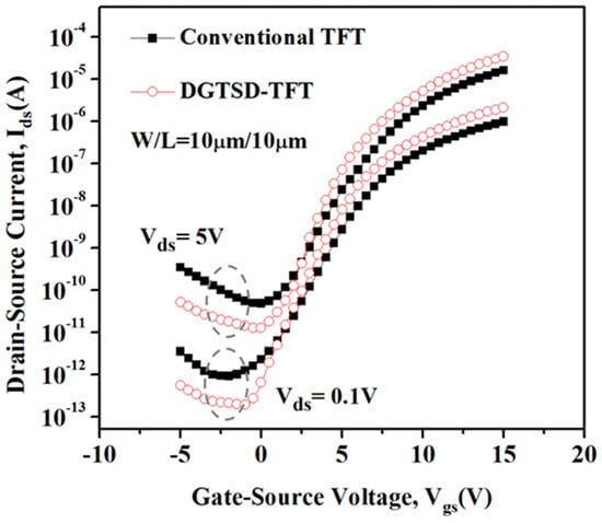 The measured transfer performance of DGTSD-TFT and a conventional top single gate structure are shown in Figure 5. It can be seen that the leakage current, which is measured at Vgs = −5 V and Vds = 5 V, of the DGTSD-TFT (5.12 × 10−11 A) is lower than that of the traditional STG TFT (3.47 × 10−10 A). This low leakage current is contributed by a low negative gate bias DEF that comes from a two-step source/drain design. Our P-GOLDD design is a two-dimensional drain doping profiles structure, which can provide a way to manipulate the location and physical extent of the high electric field near the drain [17]. In addition, our extended RSD design can form a partial thicker channel near the drain to lower the impact of the electric field superposition problem [16]. Therefore, the high DEF can be reduced and moved away from the gate electrode to lower the leakage current [17]. The threshold voltage of the proposed TFT and conventional TFT is 5.5 and 6 V (extracted at Vds = 0.1 V as Ids = 10 nA), respectively. The measured subthreshold swing (S.S.) and effective mobility (μeff) of DGTSD-TFT (conventional STG device) is 0.65 (1.34) V/dec and 20.07 (9.33) cm2/V·s, at Vds = 0.1 V. These improvements are attributed to the double gate design. The calculated ON/OFF current ratios of our proposal DGTSD structure and of the conventional one are 2.84 × 106 and 3.34 × 105, respectively. The device breakdown voltages (VBR), defined as the drain voltage when Ids = 2 nA at Vgs = 0 V [3], of the proposed TFT and conventional STG TFT, are 12.93 and 8.97 V, respectively. These improvements are attributed to the reduced DEF structures.