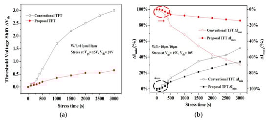 A 3000 s hot-carrier stress test for both structures was performed at Vds = 20 V and Vgs = 15 V to investigate the devices’ electrical reliability. Figure 6a depicts the shift of threshold voltage (Vth) for both devices after stress. The Vth of the STG traditional device after the reliability test changes significantly, but it remains almost the same value in our DGTSD-TFT. Figure 6b demonstrates that the current variations of the maximum ON-current drop (ΔImax) and minimum drain current increase (ΔImin) after the reliability stress. It can be observed that the ΔImax and ΔImin for the STG traditional device exhibit bigger changes than those of our DGTSD-TFT after the 3000 s hot carrier test. The ΔImax and ΔImin are 14.2% and 34.1% for our DGTSD-TFT, respectively, while those numbers are 51.4% and 69.4% for the conventional STG device. The reliability test indicates that our designed E-RSD and P-GOLDD structures are beneficial for achieving a reliable device.