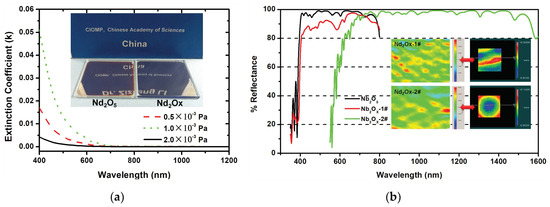 As we have been emphasizing, multi-layer coating stress is a complex model, which can be significantly influenced by lots of deposition parameters. Besides the deposition rate, temperature, spatial structure size, and oxygen partial pressure are likewise key parameters. We found that with different oxygen partial pressures, the composition of niobium oxide will be obviously changed. This will directly impact the extinction coefficient (k) of niobium oxide, light absorption, and coating stress. In Figure 7a, we can see the strong dependence of the extinction coefficient on oxygen partial pressure. From the comparison of the 30-layer HR coating samples of Nb2O5 and Nb2Ox, both have excellent surface appearance and film quality. The measured reflectance of HR coating deposited at 1.0 × 10−3 Pa can be observed as the red line in Figure 7b. Its coating stress distribution and surface shape marked as the Nb2Ox-1# are shown on the top, with mean values of −32 MPa and 0.018λ, respectively. For the regrettable absorption of niobium oxide, the averaged reflectance from 400–700 nm had a 4% reduction compared with the HR coating mentioned before, as demonstrated by the black line in Figure 7b. Based on the method of regulating oxygen partial pressure, we successfully prepared a broadband HR coating, which has an average 98.5% reflectance from 750 to 1550 nm, as the green line shows in Figure 7b. The oxygen partial pressure was set at 0.5 × 10−3 Pa. The coating stress distribution and surface shape marked as the Nb2Ox-2# are shown below, with mean values of −45 MPa and 0.04λ, respectively. The total thickness of this broadband HR coating was 7.7 μm. For such a thick coating on PMMA, the sample showed no obvious appearance defect and good environmental durability. After being repeatedly pulled by tape CT-24, the broadband HR coating exhibited a good adhesion performance.