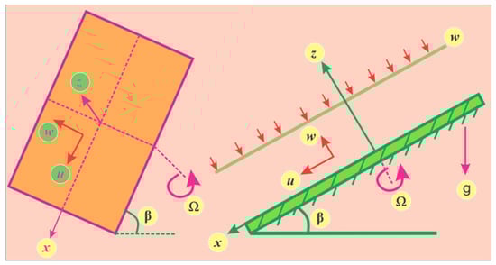 Consider a steady three-dimensional Casson nanofluid thin-film flow over a rotating disk. The rotation of the disk is due to the angular velocity (Ω) in its own plane as displayed in Figure 1. An angle, β, is made by the inclined disk with the horizontal axis. Also, h denotes the film thickness of the nanofluid, and W represents the spraying velocity. The radius of the disk is very large as compared to the liquid film thickness and hence the termination influence is unnoticed. is gravitational acceleration, T0 is the temperature at the film surface, while Tw represents the surface temperature of the disk. Likewise, C0 and Ch are the concentration on the film and on the disk surfaces, respectively. Pressure is a function of the z-axis only and the ambient pressure (P0) at the sheet of the film is kept constant. The equations of continuity, momentum, concentration, and energy for a steady state are shown in Equations (1) to (6) [8,9,10]: