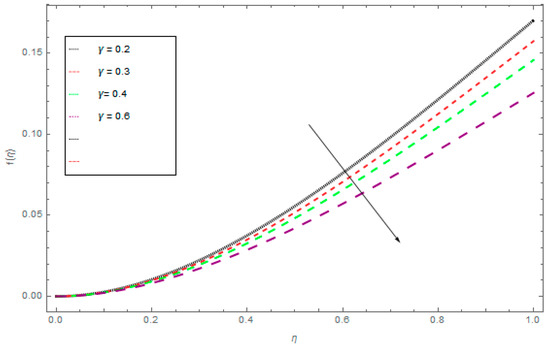 The influence of γ on f(η) when Ω = 1, ρ = 1, σ = 0.5, k = 1, M = 1.