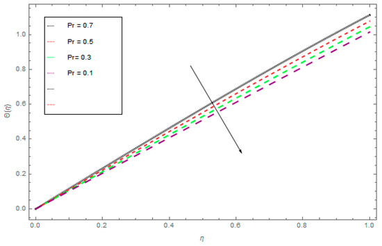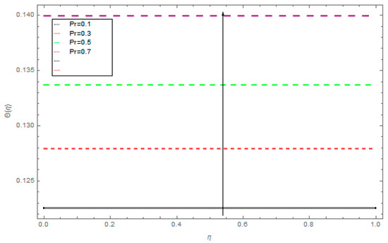 The influence of Pr on θ(η) when Ω = 1, ρ = 1, σ = 0.5, k = 1, M = 1.