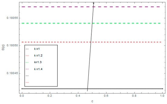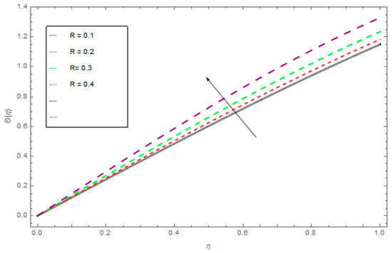 Figure 11 and Figure 12 demonstrate the effects of Pr and R. It can be seen that rising values of Pr and R increase Nu. In fact, the coaling phenomenon is enhanced with increased values of these parameters. Figure 13 identifies that Nu reduces for the amassed values of k.