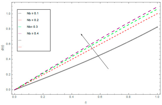 The effect of Nb on ϕ(η) when Nt = 0.6, Sc = 0.6, S = 0.7.