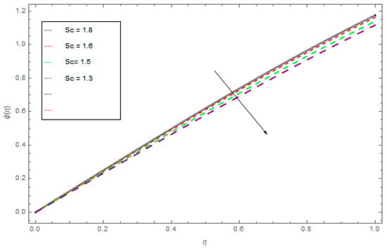 The influence of the Schmidt number (Sc) on ϕ(η) when Nb = 0.6, Nt = 0.5.