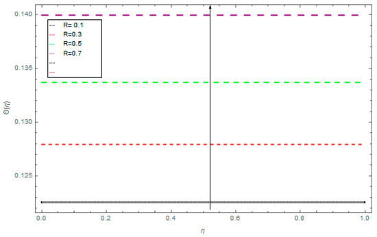 The influence of R on θ(η) when Ω = 1, ρ = 1, σ = 0.5, k = 1, M = 1.