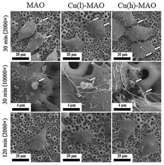 Researchers have investigated the effect of electrolyte composition on the microstructure and properties of titanium matrix micro-arc oxidation coating. It is obvious that the composition of electrolyte affects the physical and chemical properties of the coating and the growth rate of the coating [30,31]. Recent research has shown that biological elements, such as Cu, Ca, Zr, P and Si are beneficial for improving the bioactivity of materials, further enhancing implant osseointegration [32,33,34]. Huang et al. [35] investigated bone regeneration and bactericidal capacity of MAO coatings on Ti in a Cu-containing electrolyte. Macrophage-mediated osteogenesis, macrophage polarization and macrophage bactericidal assay experiments showed that coating with higher content of Cu is more favourable for macrophage proliferation. Interaction between macrophages and bacteria on various surfaces are shown in Figure 3. The capture behavior of bacteria by macrophages is significant on the surface with high Cu content, which indicates that the bactericidal capacity of macrophages is promoted on the Cu-MAO surface.