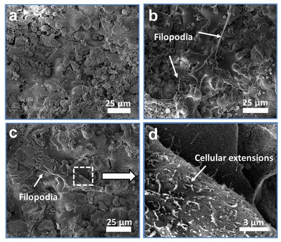 Micrographs of (a) the surface of the control group without cells and (b–d) cell morphology after culture on the (Mg, Sr)-HA coatings for five days. White arrows show filopodia of cells and cellular extensions. A large magnification (d) of the white dash box in (c) shows the cellular extensions [53]. Reprinted with permission from reference [53] 2018 Elsevier.