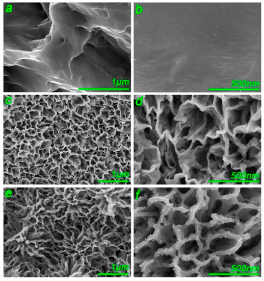 The microstructure, morphology and mechanical properties of the micro-arc oxidation coating are affected by the alloying elements. Recently, Wang et al. [36] and Correa et al. [32] have studied the effect of Ti-based alloy composition on the growth mechanism of MAO films. Additionally, in order to obtain bioactive surfaces, Hu et al. [37] prepared multilayer TiO2/CaSiO3 coating on titanium substrate by MAO and electron beam evaporation. Surface morphologies are shown in Figure 4. The needle and flake-like nanocrystals CaSiO3, which are considered a potential material for bone tissue regeneration, were deposited on TiO2 coating by electron beam evaporation. To achieve antibacterial capacity and cytocompatibility, an implant with gradient structure of Ti/TiO2/ZnO was developed by MAO followed by hydrothermal treatment, as reported by Zhang et al. [38].