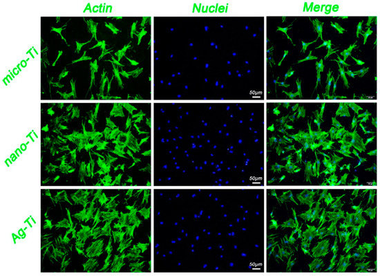 Investigation of the initial adhesion and spreading behaviors of mesenchymal stem cells (MSCs) after 24 h of culture on the samples micro-Ti, nano-Ti and Ag-Ti. Note: actin, green; nuclei, blue [62]. Reprinted with permission from reference [62] 2016 Elsevier.