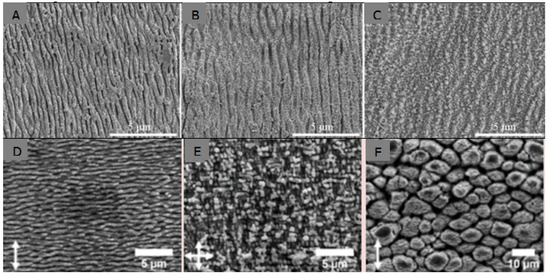 SEM micrographs of laser-induced periodic ripples surface structures (A–D), nanopillar (E) and microcolumn (F) textured surfaces [78,79]. Reprinted with permission from reference [78] 2015 Elsevier.