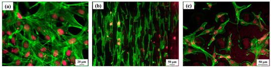 In addition to femtosecond lasers, researchers have also explored the surface modification behavior of other lasers by controlling machining parameters. Marticorena et al. [80] showed that laser irradiation of pure titanium films with different pulse frequencies produces surface structures with different morphologies. Experimental results show that the surface microstructure, texture and roughness of implant surfaces are important for the biocompatibility of implants in vivo. Additionally, Trtica et al. [81] found that liquid (water) is the preferred medium for the surface structure of titanium alloy implants. At the same time, water also showed high oxidation capacity, which promotes the surface biological activity. Hsiao et al. [82] developed an efficient method to increase surface roughness in titanium alloy (Ti-6Al-4V) with a low energy pulsed ultraviolet (UV) laser, which was similar to laser modified surfaces. Renu et al. [83] presented laser surface texturing of titanium alloy (Ti-6Al-4V) with line and dimple geometry using ArF excimer laser. After laser modification, Young’s modulus, corrosion resistance and nano-hardness increase as compared with the as-received titanium. The fluorescence micrograph showed that the surface morphology controls cell adsorption and growth direction, as shown in the Figure 11.