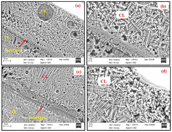 Cross-sectional morphology of 100% HA and functionally graded material (FGM) laser cladding at laser energy density (LED) 21.6 J/mm2 (a,c) interface between the crust layer (CL) and the transition layer (TL) (low magnification) and (b,d) CL (high magnification) [90]. The top layer of cladding is identified as CL. Beneath the CL, the TL is present, where transition of elements between cladding and substrate occurs. Reprinted with permission from reference [90] 2018 Elsevier.