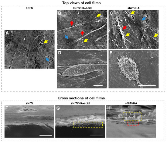Osteoblast morphology on different sNiTi plates [92].After three days of osteoblast culture, the top view of the cell monolayers was imaged by SEM: (A) sNiTi; (B) and (D) sNiTi/HA-acid; (C) and (E) sNiTi/HA. Representative areas in (A–C) showing mineral deposits (yellow arrows), cell nuclei (blue arrows), and lamellipodia (red arrows). Some cells displayed a dome shape on sNiTi/HA-acid, as in (D); and sNiTi/HA, as in (E); no similar cells were found for sNiTi. Cross sections of the osteoblast monolayer were also imaged: (F) sNiTi; (G) sNiTi/ HA-acid; (H) sNiTi/HA. A fibrous structure which is highlighted by yellow rectangles was observed in (G,H) and possibly represents extracellular matrix. The red rectangle in (H) indicates possible mineralized microspheres attached to the cell monolayer. Scale bar: 10 µm. Reprinted with permission from reference [92] 2018 Elsevier.