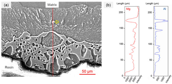 A coating was obtained by the compact powder diffusion alloying process with a diffusion source containing 1 g of NH4Cl, 10 g of Al powder, 10 g of Al2O3 powder, and a cross-section of the as-diffusion alloyed specimen with the coating is shown in Figure 2a. It could be figured out that the thickness of the coating varies from tens of micrometers to one hundred micrometers. Moreover, as shown in Figure 3, the Mg element and the Al element coexist in the as-diffusion alloyed coating, which indicates that this coating is an intermetallic coating. Meanwhile, the Al content in the network-shape phase is obviously higher than that in the matrix, which indicates that the intermetallic coating is rich in Al. Additionally, there is mainly the Mg17Al12 phase and magnesium solid solution in the intermetallic layer [15].