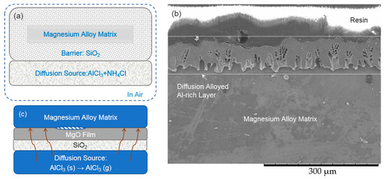 An experiment was carried out to clarify whether it is possible to simplify the diffusion source which was composed of AlCl3 and NH4Cl further to a new diffusion source which was only composed the AlCl3 powder. As shown in Figure 7a, there was only the AlCl3 powder in the diffusion source. A layer of SiO2 was also utilized to separate the magnesium alloy matrix from the diffusion source. After the diffusion alloying process, it is hard to find an intermetallic layer on the magnesium alloy specimen as shown in Figure 7b. This result illustrates that the NH4Cl powder is important in a powder thermal diffusion alloying process on a magnesium alloy matrix. As shown in Figure 7c, if the diffusion source is lacking NH4Cl, a compact MgO film could form on the surface of the magnesium alloy specimen. Thanks to the decomposition of the NH4Cl powder, the HCl gas could turn a compact MgO film into a loose one as described in Equation (3) and (4), thus the AlCl3 gas has the chance to penetrate the loose MgO film to arrive at the magnesium alloy matrix.