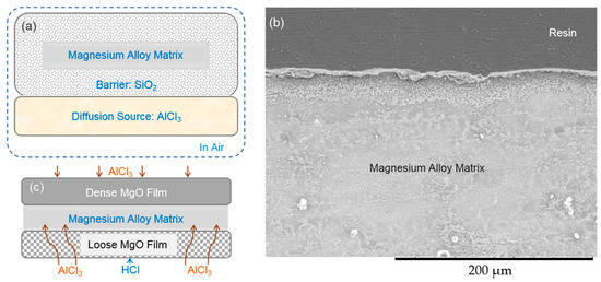 (a) The illustration of the powder thermal diffusion alloying system to investigate the effect of NHCl4 on the MgO film; (b) Cross section of the as-diffusion alloyed specimen utilizing the diffusion system shown in (a); (c) Effect of the HCl gas on the MgO film.