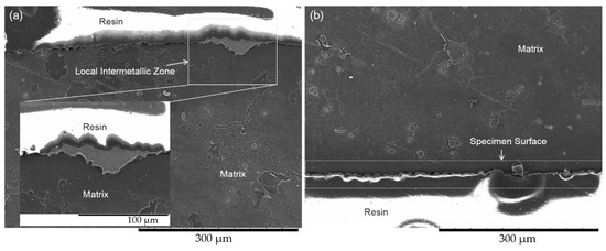As shown in Figure 10a, the thickness of the intermetallic layer on the original specimen was around 100 μm and the intermetallic layer was continuous and relatively complete. While, as shown in Figure 10b, after another heat treatment with excess NH4Cl powder, only a few local intermetallic zones are found on the magnesium alloy specimen surface, the thickness of the local intermetallic zone is no more than 50 μm. Moreover, the as-eroded specimen has a much more curved surface. This confirms that the excess NH4Cl powder could deteriorate the newly formed intermetallic layer, hence, both the thickness and the domain of the intermetallic layer was reduced. Hence, to fabricate a considerable intermetallic layer on the magnesium alloys by the powder thermal diffusion alloying method in the air, the content of the NH4Cl powder should be limited in a reasonable region.