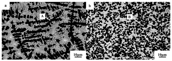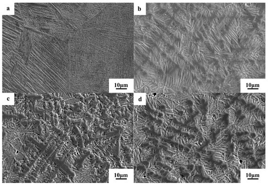 The microstructure of coatings with different ZrN additions is shown in Figure 2. When the addition amount of ZrN is 10 wt.%, coating shows a uniform α + β basket-weave microstructure without the observation of new phase, which is consistent with the results of Yang et al. [22]. When the addition amount of ZrN increases to 20 wt.%, precipitations with dendritic morphology start to precipitate from the matrix with α + β basket-weave microstructure. Moreover, the number of dendritic precipitations increase with an increase in the amount of ZrN. The backscattered electron analysis results shown in Figure 3 indicate that the shape of precipitates changes from the dendritic morphology to spherical shape at the bottom of the coating.