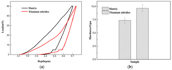 (a) Nano-indentation load-depth curves for precipitations (TiN) and matrix of 30ZrN, and (b) hardness of precipitations (TiN) and matrix of 30ZrN.