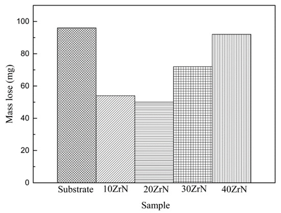After the wear test, the mass loss of the different coatings is illustrated in Figure 9. It can be seen that the mass loss of the substrate is 96(±2.7) mg, after addition of 10 wt.% of ZrN, the weight loss dramatically decreases to 54(±1.90) mg. With further increase in the ZrN to 20 wt.%, the weight loss continued to decrease to 50(±2.50) mg. However, when the addition amount of ZrN exceeds 30 wt.%, the weight loss of the coating increases again with similar weight loss observed in the sample of 40ZrN and substrates. Sample 20ZrN shows the best wear resistance and mass loss, which is only one-half of the titanium alloy matrix.
