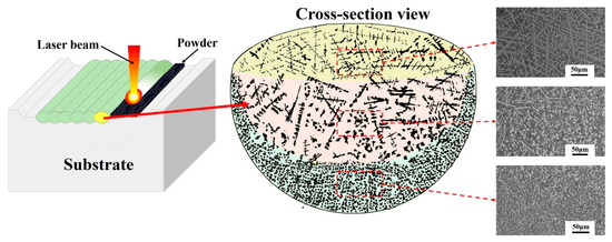 TC11 titanium alloy has the advantages of low density, high strength, and excellent corrosion resistance, and it is usually used in the manufacture of large and complex parts such as compressor discs for aircraft engines [1,2,3,4,5]. However, TC11 titanium alloy has low surface hardness with poor wear resistance, which greatly limits its application [6]. Surface modification techniques such as vapor deposition, surface carbonitride, and laser surface treatment are commonly used to improve the wear resistance of titanium alloy [7]. However, traditional carburizing and nitriding may cause the change of microstructures in the alloy, while the bonding strength between the cladding layer and substrate is always very poor when using chemical vapor deposition (CVD) method and physical vapor deposition (PVD) method [8]. The processing times of conventional coating techniques are always long [9]. Laser cladding technology is a newly developed surface modification technology, which can rapidly melt and solidify the pre-mixed powders to obtain a cladding layer with excellent properties. Meanwhile, the bonding strength between the coatings and substrate are excellent, and the coating thickness can be easily adjusted by changing the powdering feeding rates and processing parameters [10,11,12,13].