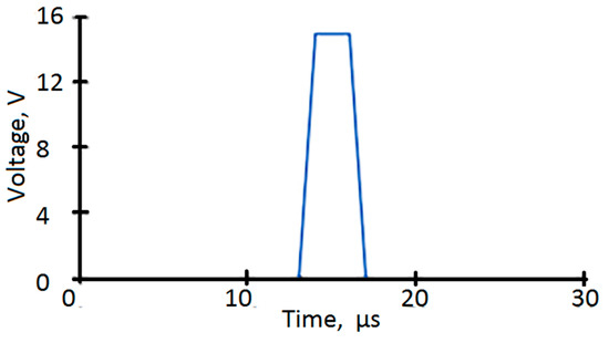 The inkjet printing was performed by a Dimatix Fujifilm DMP-2831 printer (FUJIFILM Dimatix, Inc., Santa Clara, CA, USA) equipped with cartridges allowing for drop formation with a volume of 10 pL (model #DMC–11610). The waveform responsible for the manipulation of a piezoelement, whereby printing is performed, is presented in Figure 1.