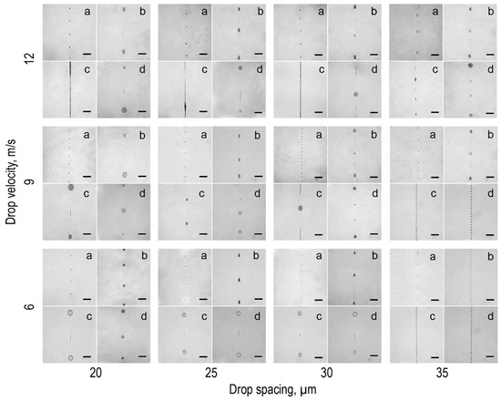Array of optical images of a 1 pxl line printed on PDMS when cured for 5 min at 80 °C depending on drop spacing and velocity. The scale bar is 100 µm.