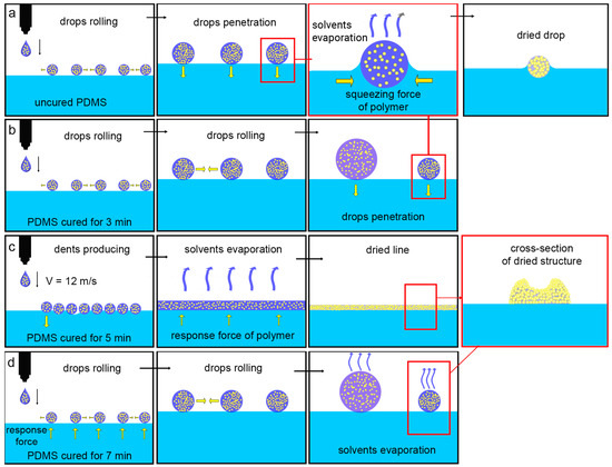 Schematic illustration of ink drops behavior printed on PDMS films cured for (a) 0, (b) 3, (c) 5, and (d) 7 min.