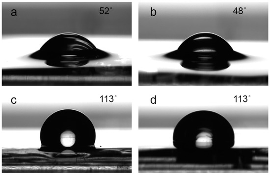 The contact angle of ink drops on PDMS surface cured for (a) 0, (b) 3, (c) 5, and (d) 7 min.