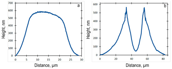 The results of the contact angle measurements showed that for 5 and 7 min of PDMS curing, no penetration into the polymer volume was observed. In this case, printing on a hydrophobic elastic surface was performed. The diameter of the coalescent drops in Figure A3 and Figure A4 was larger than in Figure A1 and Figure A3. Additionally, they had a spherical shape. This can be explained by the fact that already-cured polymer does not wrap drops that are deposited on a substrate surface. Thus there was no compression force, as in this case the PDMS was a solid film. This fact can also be confirmed by the cross-sectional topography of the line printed on PDMS that was cured for 5 min and obtained by AFM with a strongly pronounced “coffee-ring” effect (Figure 5b).