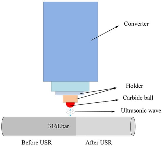 A schematic illustration of an ultrasonic surface rolling (USR) setup, in which an ultrasonic apparatus was installed in a CNC lathe, is shown in Figure 1. During the USR processing, a carbide alloy rolling ball, driven by ultrasonic waves, was applied to achieve a high-frequency impact and rolled on the samples under a static force. In the present work, the following USR parameters were used: a rolling ball diameter of 14 mm, an ultrasonic vibration frequency of 28 kHz, a vibration amplitude of 5 μm and an applied static force of 300 N. A single-pass USR process was used to enhance the wear-resistance of AISI 316 L stainless steel. While a multi-pass USR process is generally employed to obtain the gradient nanocrystalline structure, it is energy-extravagant and efficiency-deficient.