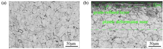 Figure 3 shows the typical cross-sectional OM images of the as-received sample and the USR sample. The microstructure of the as-received sample was mainly composed of equiaxed austenitic grains, with a mean size of 19 μm, embedded with a few annealing twins, as shown in Figure 3a. Notably, plastic deformation and grain refinements were observed in the top-surface layer, as shown in Figure 3a. The depth of the surface grain-refined layer extended to around 15 μm. The original austenitic grains in the subsurface were compressed and elongated in the direction parallel to the specimen surface, indicating a plastic deformation zone due to ultrasonic striking during USR. In the plastic deformation zone, deformation twins within grains were clearly observed.