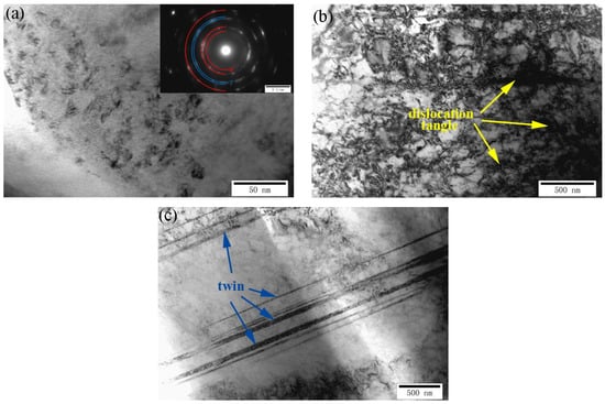 Typical cross-sectional TEM micrographs, shown in Figure 4a–c, characterized the microstructures of the USR sample’s surface. It was apparent that equiaxed nanograins were formed in the top-surface layer of the USR sample, indicating surface nanocrystallization by USR [27,28]. The corresponding SAED patterns confirmed the nanograin microstructures of the USR sample’s surface and indicated that the nanostructured surface layer is composed of martensite and austenite grains with random crystallographic orientations. The grain size ranged from approximately 6 to 15 nm, which was comparable with that generated by SMAT [29], while it was much smaller than that generated by SMRT [17]. The equiaxed nanograins were generated through dynamic recrystallization under severe plastic deformation, induced by USR. The detailed formation of the nanograins for coarse-grained polycrystals by USR involved various dislocation activities and the development of grain boundaries, which were similar to the results obtained by SMAT [27]. The high density of dislocations and dislocation tangles within the austenitic grains in the plastic deformation zone provided evidence for the above inference (Figure 4b). Moreover, increased deformation twins were visible in the plastic deformation zone (Figure 3a and Figure 4c), which indicated that mechanical twinning played an important role in the formation of nanograins. Because 316 L stainless steel exhibits a low stacking fault energy, mechanical twinning prevails in server plastic deformation. The high plastic strain subjected to USR played a crucial role in the formation of the nanostructure, and it facilitated dislocation generation and suppressed dislocation annihilation [30]. The surface nanocrystallization induced by USR has been found in several metals, such as 40Cr [24], 304 stainless steel [31], and Ti6Al4V [32]. The present nanostructure surface layer was relatively thin because of the insufficient plastic deformation subjected to the single-pass USR. The thick nanostructure surface layer could be obtained by increasing the passes of USR.